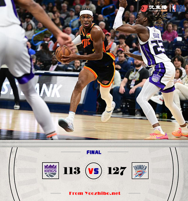 直播车讯 2月12日 NBA常规赛,雷霆主场迎战国王,雷霆目前2连败后35胜17负排在西部第4位,国王则是30胜21负排在西部第5位。比赛开始,双方上来都迅速进入状态,小萨博尼斯继续有攻有传撑起球队进攻,蒙克替补上来状态上佳,而亚历山大则是状态火热单节砍下15分,首节雷霆领先15分,次节杰伦-威廉姆斯上来连续突内线砍下10分,雷霆顺势打出10-2进攻波一举拉开比分,随后双方围绕双位数分差展开拉锯战,半场雷霆领先10分。下半场,小萨里突外投连续追分后国王突然断电,雷霆众将多点开花,里突外投打出16-0超级攻击波一举拉开20分以上领先,又是蒙克连续远投止血,三节结束雷霆领先17分,末节国王上来下起三分雨一波14-5直接追至个位数分差,杰伦-威廉姆斯站出来连续中远投止血,亚历山大也是接连中远投稳住局势,雷霆牢牢守住双位数领先,最终雷霆127-113力克国王。