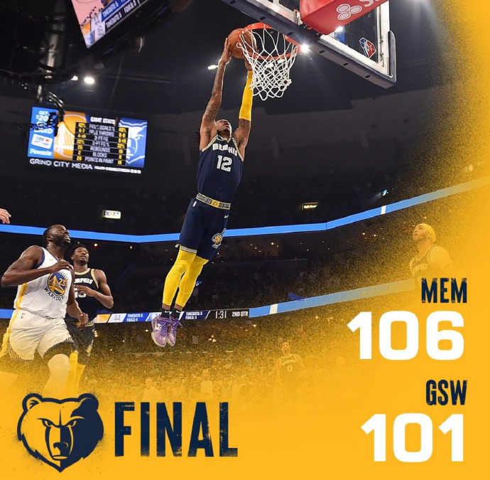 灰熊(1-1):莫兰特47分8篮板8助攻3抢断,小贾伦-杰克逊12分7篮板2封盖,贝恩5分6篮板,蒂尔曼7分6篮板3抢断,扎伊尔-威廉姆斯14分5篮板,克拉克10分3篮板,梅尔顿3分8篮板3封盖。