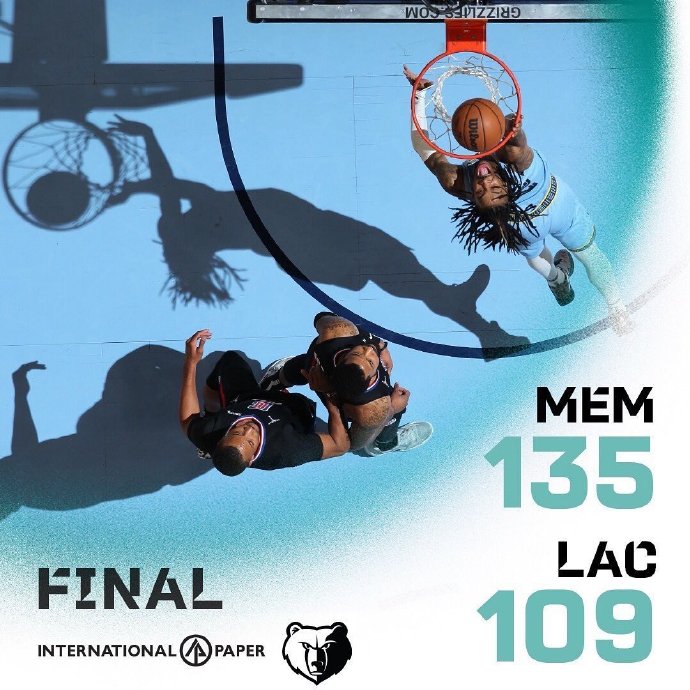 灰熊(38-18):莫兰特30分7篮板5助攻,贾伦-杰克逊26分11篮板1帽1断1助攻,扎伊尔-威廉姆斯10分1断,亚当斯9分8篮板3助攻,贝恩5分4篮板4助攻2断,梅尔顿6分2篮板4助攻3断2帽,凯尔-安德森11分8篮板3断,克拉克18分7篮板4助攻3帽,康查尔10分5篮板,泰厄斯-琼斯7分2篮板3助攻