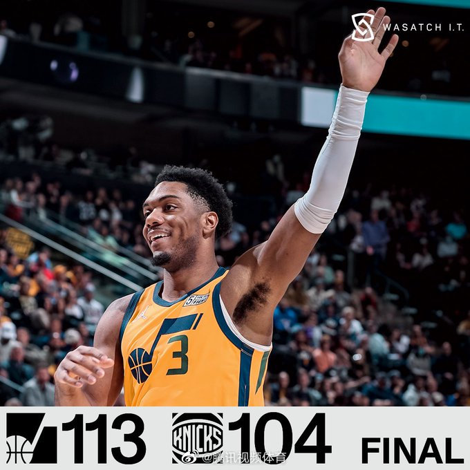 直播车2月8日讯 NBA常规赛继续进行,爵士主场迎战尼克斯,爵士目前一波2连胜排在西部第4位,而尼克斯则状态不佳,2连败暂列东部第12位,本场戈贝尔继续缺战。开局尼克斯进入比赛状态较快,由于戈贝尔缺阵爵士内线被疯狂针对,尼克斯也打出攻击波建立优势,但末段爵士抓住尼克斯得分荒成功回应小高潮并追平比分,次节米切尔终于找到手感,里突外投为爵士打出小高潮并反超比分,随后双方互相攻击内线并造杀伤,比分也是交替领先,节末康利的不错发挥还是帮助爵士领先2分。第三节爵士率先领先到双位数,但随后外线连续打铁突然陷入长达6分多钟的得分荒,尼克斯抓住机会多点开花打出24-2超级进攻波一举建立领先,节末爵士依靠三分紧急止血,末节双方手感都有下滑,爵士挑战成功后接连扔进三分开始掌握主动权,尼克斯多次追分反超机会把握不住,米切尔发力杀内线帮助爵士重新领先至双位数,最终爵士险胜尼克斯,拿到3连胜的同时送给对手3连败。