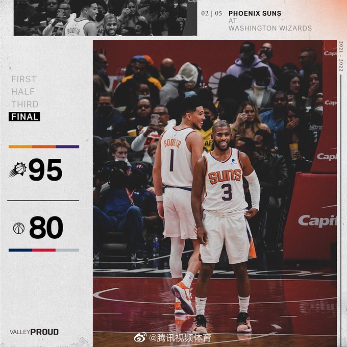 直播车2月6日讯 NBA常规赛,太阳客场挑战奇才。太阳刚刚不敌老鹰,连胜虽然遭到终结,仍旧稳居联盟榜首。奇才力克76人止住连败,目前排在东部倒数第五。比尔本场继续缺阵。一开场,奇才率先发力8-2领先,此后太阳大举反击,连续打出进攻高潮,领先12分结束首节。第二节,奇才半节时间仅拿到2分,太阳完成15-0的攻击波扩大优势,半场战罢太阳59-32领先27分。下半场,太阳轻松将分差拉开到30分以上,奇才苦苦支撑,三节打完太阳握有34分领先。第四节,过大的分差让比赛早早失去悬念,双方换上替补耗完垃圾时间。最终,太阳大胜奇才,客场过关。