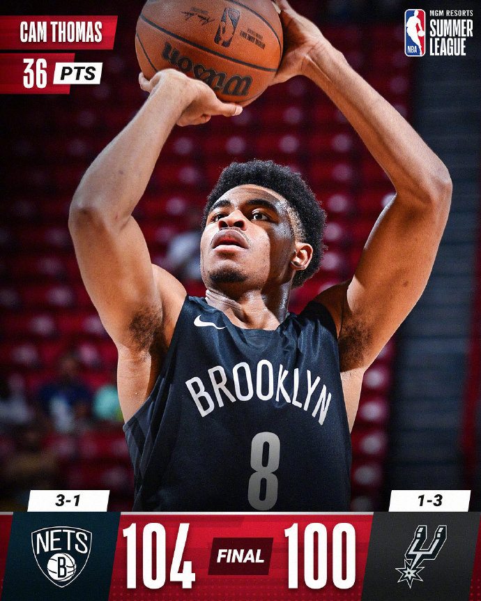 直播车8月16日讯 NBA夏季联赛,篮网今日对阵马刺,前者已经取得两连胜,而后者在上场比赛才险胜黄蜂取得首胜。比赛上来马刺就展示了火热的外线手感,连续命中多记远投,而篮网的进攻效率则是极低,场上分差迅速就达到了两位数,次节篮网虽然多次发起追分,但半场结束时仍落后5分。易边再战篮网继续反扑,在第三节末段他们打出一波10-2的攻势终于实现反超,末节两队开始陷入拉锯,比赛悬念一直保持到了最后,关键时刻托马斯连续得分帮助篮网带走胜利,最终篮网险胜马刺,获得三连胜。
