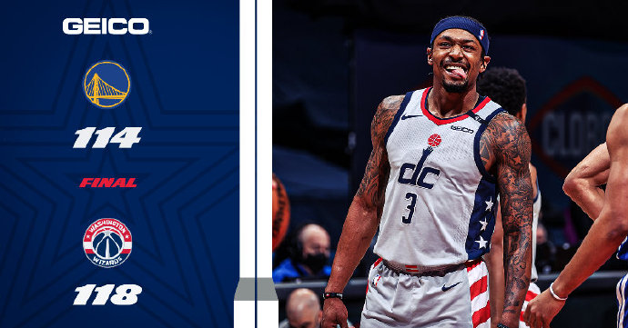 直播车4月22日讯 今日NBA常规赛,勇士客场挑战奇才,勇士过去8战6胜,而奇才目前也已经取得5连胜。比赛开始后,奇才率先找到进攻节奏,打出一波11-0进攻高潮取得领先,勇士连续出现失误而且投篮接连打铁,首节比赛奇才38-20领先勇士18分。第二节比赛开始后,奇才进攻效率降低陷入得分荒,勇士抓住机会开始发起反击,连续打出进攻高潮将比分缩小至只剩2分。下半场比赛开始后,奇才连得7分将将领先优势扩大至9分,之后勇士开始发力,勇士里突外投打出一波13-0将比分迅速,三节战罢,勇士93-86反超奇才7分。最后一节,勇士外线将领先优势扩大至9分,奇才不断冲击勇士内线缩小比分,双方分差一度只剩一分,最后奇才连续突入内线将比分反超,最后奇才118-114力克勇士。
