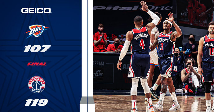 直播车4月20日讯 奇才今日坐镇主场迎来雷霆的挑战,奇才在后场双枪比尔和威少的带领下取得4连胜,并拿到最近7场比赛里的6场胜利,同时也是威少来到奇才后首次面对老东家,新人当家的雷霆则一路溃败目前遭遇10连败。首节之争状态出色的奇才迅速抢占先机,比尔开局连砍7分带队打出17-8的攻势并占据上风,次节奇才替补阵容接棒继续砍分最多取得17分的领先,不过后半节主力回归反倒不会打球,而雷霆在布拉德利不断吃饼进球中回敬一波19-6的攻势追回比分,半场结束时奇才优势仅剩6分。下半场对决奇才虽然一直保持着10分上下优势但无法早早杀死比赛,雷霆末节开局一波11-2的攻势一度追至2分看到希望,不过这之后奇才外线开火下起三分雨,他们顶住压力重新取得两位数领先锁定胜局。最终,奇才击退雷霆迎来5连胜,同时送雷霆11连败。