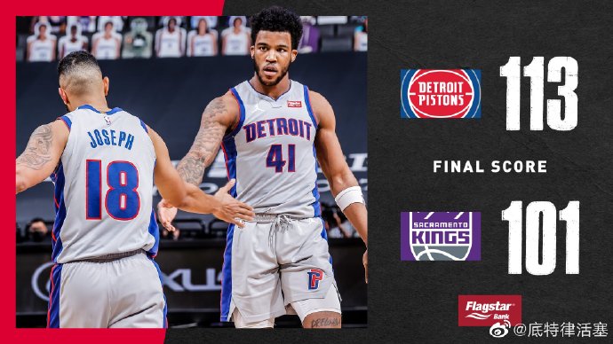 直播车4月9日讯 NBA常规赛,国王今日迎战活塞,前者四连败后排在西部第十二位,而后者上场比赛则是输给了掘金,继续在东部垫底,本场格兰特、普拉姆利和巴格利等人缺战。比赛上来两队便陷入拉锯战,场上比分交替领先,首个暂停之后活塞逐渐取得场上的微弱领先,在进入次节后活塞完全占据场上主动,分差也一度达到了二十分,半场结束时场上分差为18分。易边再战,国王多次发起反扑攻势,分差最小时仅剩7分,不过却始终没能更进一步,最终活塞力克国王送给后者五连败。
