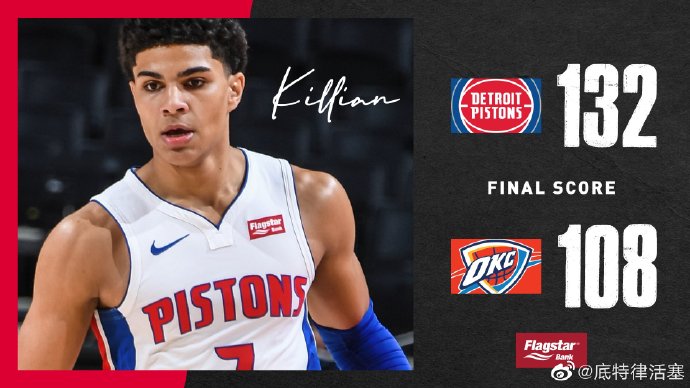 直播车讯 4月6日讯 今日NBA常规赛,活塞迎战雷霆,活塞上场44分不敌尼克斯,而雷霆则48分不敌开拓者,双方今日均渴望获得一场胜利。比赛开始后,活塞迅速找到进攻状态,接连打出进攻高潮迅速将分差拉大,雷霆虽有调整,首节结束仍落后活塞11分。第二节前半段,活塞延续首节进攻火力,分差最多时已经来到23分,雷霆外线手感逐渐回暖,半场结束,活塞58-47依然保持11分领先。易边再战,活塞内外兼修持续发力,不断扩大领先优势,雷霆进攻受阻,三节战罢,活塞将领先优势扩大至16分。最后一节,活塞主力没有登场,雷霆进攻效率依然不高,活塞一度将分差扩大至27分,比赛早早失去悬念。最终活塞132-108轻取雷霆。
