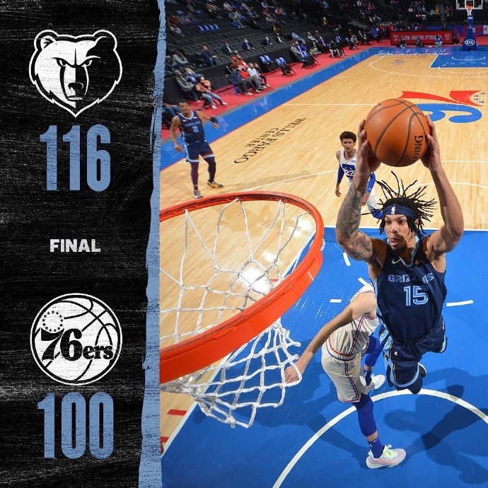 直播车4月5日讯 NBA常规赛,灰熊客场挑战76人,灰熊上一场战胜森林狼排名西部第9,76人还是凭借胜负差排名东部榜首,恩比德本场因膝盖康复缺阵。开局阶段灰熊比较慢热,但随后莫兰特带领灰熊保持领先,末段的一波小高潮帮助灰熊领先7分,次节76人通过一波小高潮咬住比分,布鲁克斯末段站出来连续得分帮助灰熊领先10分进入下半场。易边再战,灰熊外线手感火热而且多点开花,76人仅有哈里斯状态说的过去,灰熊将分差越拉越大,三节结束灰熊单节45分已经领先26分,末节两队主力也没有再上,分差保持在20分以上,双方早早换上替补进行练兵,但76人一众替补又把灰熊主力打了上来,但是没有剧本发生,最终灰熊战胜76人。