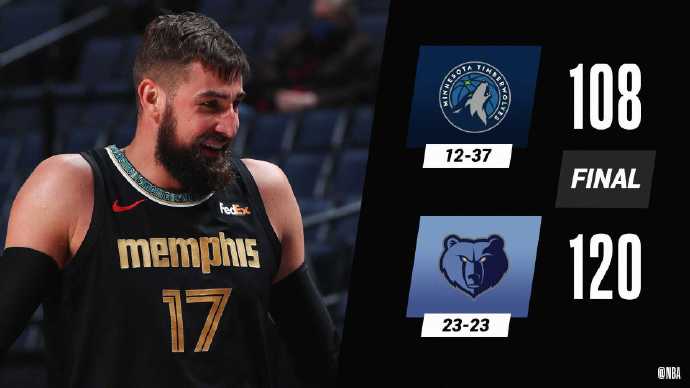 直播车4月2日讯 灰熊坐镇主场迎战森林狼,目前灰熊排名西部第10,距离第8的马刺还有1.5个胜场,森林狼是他们冲击季后赛道路上必须拿下的对手,此役卢比奥因伤缺阵。首节两队开局势均力敌,森林狼虽然打出8-0的小高潮,但灰熊靠着替补球员给力的发挥还是将比分反超,次节灰熊一波15-3将分差扩大到两位数,然而顽强的森林狼却用一阵三分雨将劣势抹平。下半场,森林狼一度陷入4分多钟的得分荒,好在他们抓住瓦兰丘纳斯4犯下场之际打出15-5的攻击波完成反超,但灰熊却在末节多点开花打出23-6的攻击狂潮将分差拉大到20分以上,森林狼后继乏力未能顶住对手的猛攻,最终灰熊主场120-108击败森林狼,距离西部第8只有一步之遥。