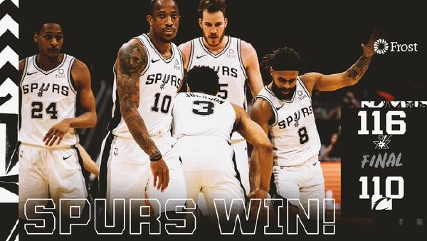 马刺(22-16):凯尔登-约翰逊23分21板2帽、德罗赞20分7助、穆雷22分6板3助、怀特17分4板2助、米尔斯12分2助、盖伊10分4板