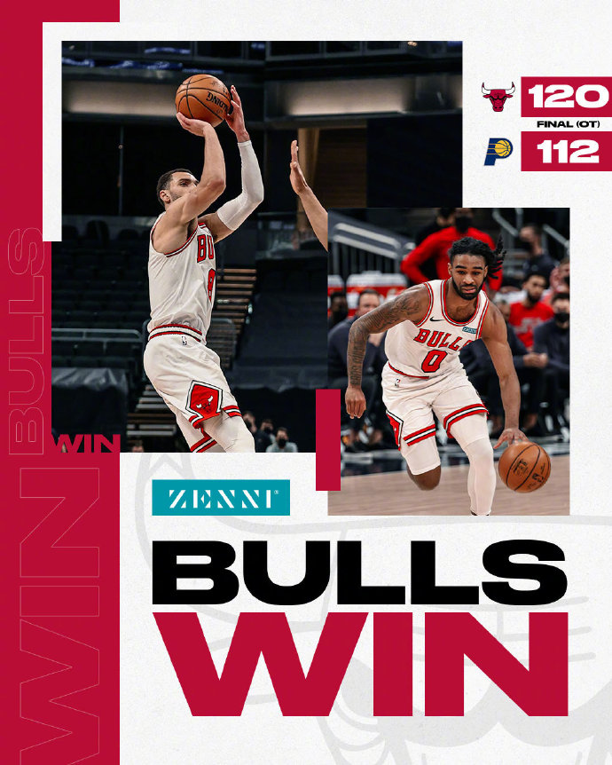 公牛(11-15):拉文30分9板、坦普尔16分、怀特19分7板8助、小卡特11分9板、威廉姆斯7分9板、赛迪斯-杨13分11板、萨托兰斯基13分。