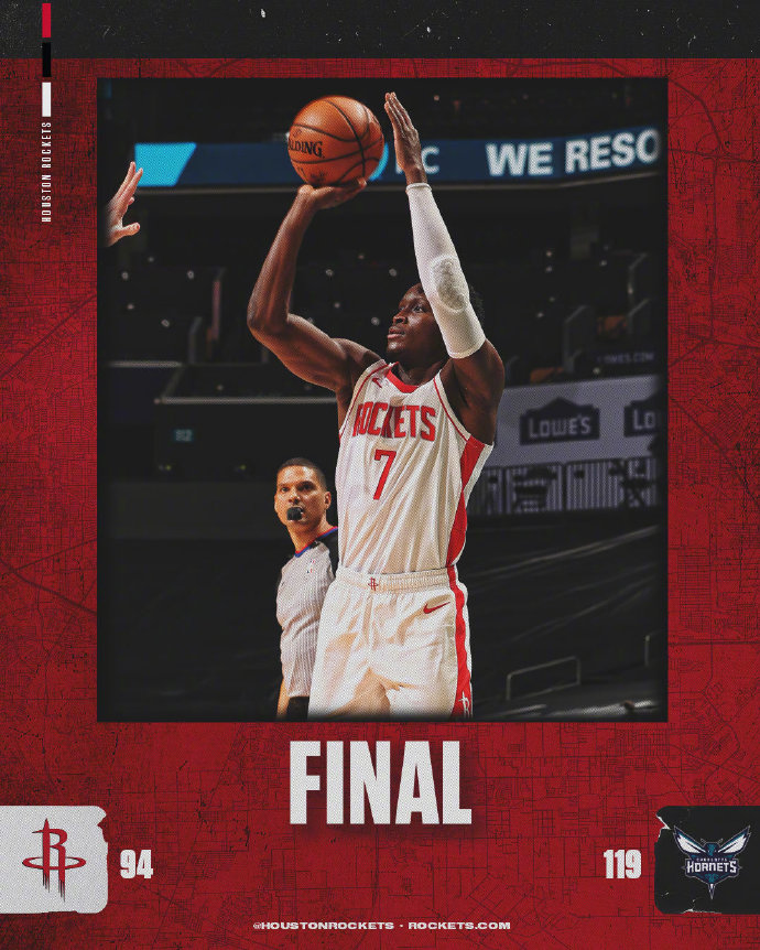 直播车2月9日讯 火箭今日奔赴夏洛特客场挑战黄蜂,火箭这边除了受伤的伍德外,沃尔和戈登全都轮休缺阵。缺少多名核心的火箭在开局的对攻中虽然落入下风但表现顽强一直咬住比分,次节在麦克勒莫爆发单节砍下15分的带动下一度反超比分,不过黄蜂这边鲍尔同样有着出色发挥,他半场15分5助的表现帮助黄蜂及时稳住局势并带着4分领先进入下半场。第三节的火箭虽然继续落后但打的很顽强,节末也一度追平了比分,然而第四节初莫名的哑火直接导致溃败,他们开局前7分钟里仅得1分,而黄蜂抓住机会送出19-1的攻势一举拉开比分奠定胜局,火箭这一节仅得7分。最终,黄蜂主场轻取火箭拿下比赛。