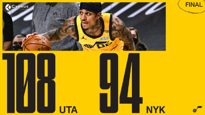 直播车1月27日讯 爵士坐镇主场迎战尼克斯,上半场尼克斯杀出奇兵,替补上场的小里弗斯里突外投独砍25分,率领尼克斯在半场战罢以59-46建立起两位数领先。易边再战,爵士找到手感,康利、博格丹诺维奇和米切尔等连中三分,爵士凭借这波三分雨抹掉分差。末节爵士延续手感火热手感,奥尼尔等连续得分,帮助球队反超比分。而尼克斯则命中率暴跌,整个下半场仅得到35分。最终,爵士以108-94逆转尼克斯,豪取9连胜,同时送给尼克斯3连败