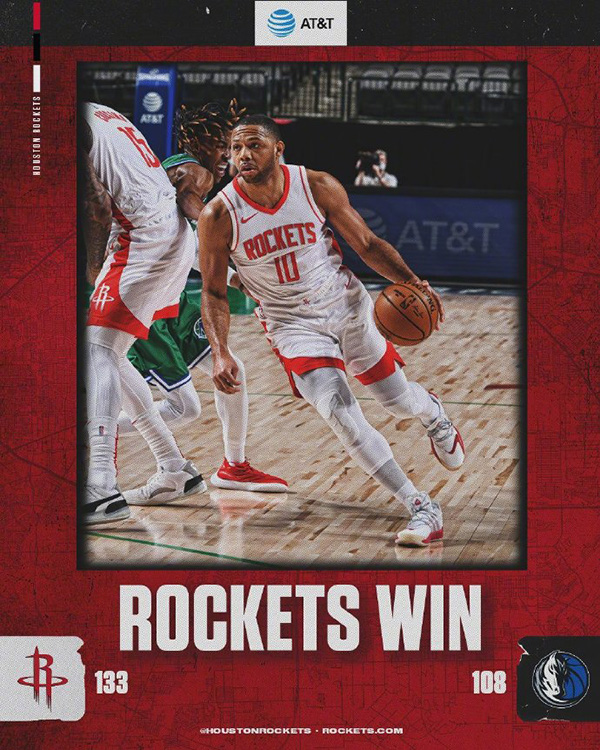 直播车1月24日讯 独行侠坐镇主场迎战火箭,两队都是背靠背作战,此役沃尔伤愈复出,波尔津吉斯则因伤病管理缺阵,鲍威尔、约什-理查德森等因健康安全协议缺阵。本场比赛考辛斯梦回巅峰开场即迅速进入状态频频砍分,率领火箭早早就建立起两位数领先。易边再战,考辛斯延续手感和戈登在第三节带队再打出高潮进一步拉开比分,缺兵少将的独行侠在攻防两端全面处在下风,比赛悬念提前失去。最终,火箭在客场以133-108大胜独行侠,取得2连胜。