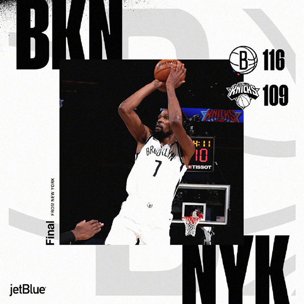 直播车1月14日讯 NBA常规赛篮网对阵尼克斯,尼克斯近来状态不佳遭遇3连败。开场后虽然尼克斯率先发力,但是杜兰特带领篮网追上比分并完成反超,第二节上来篮网又是一波攻势确立领先。兰德尔接连砍分为尼克斯追分,上半场篮网61-45领先。下半场回来虽然巴雷特和兰德尔继续为尼克斯追分,但篮网进攻状态仍旧出色,尼克斯虽然在最后时刻将分差缩小到4分,但为时已晚,最终篮网116-109送给尼克斯4连败。