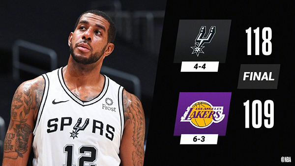 直播车1月8日讯 湖人坐镇主场迎来马刺的挑战,马刺上一场击沉快船结束4连败,湖人则延续状态目前豪取4连胜。上半场的马刺反客为主早早进入状态,凭借着双德首节合力攻下24分,马刺抢得先机取得8分领先,次节湖人仍然阻止不了马刺的进攻,马刺半场高效率命中10记三分,球队凭借出色的内外结合保持9分领先进入下半场。第三节湖人末段发力并送出15-5的攻势抹平比分看到希望,然而他们第四节初又一次哑火,盖伊连砍8分成为关键先生,马刺送出一波11-4的攻势重新取得两位数的领先奠定胜局,最终,马刺客场击败湖人并终结对手4连胜。