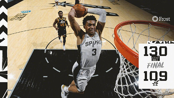 直播车1月4日讯 NBA常规赛爵士客场对阵马刺,马刺近来状态不佳遭遇3连败。开场后爵士就早早进入状态,他们在三分线外多次命中三分取得领先,第二节克拉克森和博格达诺维奇继续带领爵士打出攻势一举将分差拉大到21分,虽然沃克和约翰逊为马刺一度缩小分差,但米切尔等人手感火热,上半场结束时爵士65-51领先马刺。下半场回来虽然马刺多次杀入内线得手,但戈贝尔也多次送出大帽,爵士外线又是多次三分雨下,第四节爵士依旧保持火热手感,马刺追分无望,最终爵士130-109送给马刺4连败。