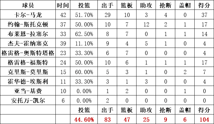 爵士队统计: