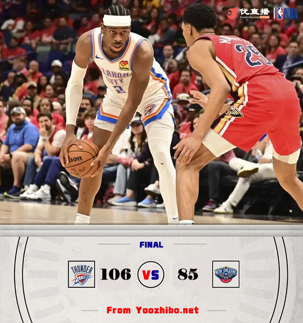 直播车4月28日讯 NBA季后赛,雷霆客场挑战鹈鹕。目前总比分雷霆2-0领先。比赛开始,双方开场势均力敌,比分交替领先,雷霆内外开花占据主动,次节前半段双方依旧缠斗,此后雷霆突然发力,三分4连击将分差拉开到两位数,半场战罢雷霆60-46领先14分。易边再战,雷霆牢牢占据场上主动,又是三分3连击扩大优势,鹈鹕强攻内线拿分苦苦支撑,末节雷霆持续发力打出10-2将分差拉开到20分以上,鹈鹕大势已去无力回天。最终,雷霆106-85再胜鹈鹕,总比分3-0领先拿到赛点。