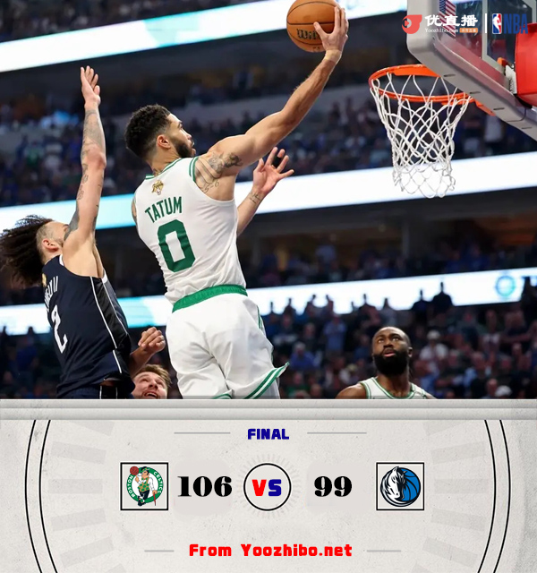 直播车 6月13日讯 NBA总决赛G3,独行侠今日回到主场迎战凯尔特人,在前两场比赛中凯尔特人都是拿下胜利,大比分2-0领先,此役波尔津吉斯因脚伤缺战。比赛上来,回到主场的独行侠就迅速抢下开局打出9-2的攻势取得领先,分差此后也是拉开到了两位数,好在是凯尔特人及时调整回应一波11-0的小高潮追上比分,次节双方的命中率都出现下滑,场面也是十分胶着,半场结束时独行侠领先1分;下半场回来,独行侠的进攻表现依旧糟糕,单节只拿到19分,而杰伦-布朗则是迎来爆发,单节独得15分帮助凯尔特人取得15分的领先优势,末节上来凯尔特人又是连中两记三分将分差扩大到二十分以上,但随后独行侠就轰出22-2的攻势打回悬念,关键时刻东契奇犯满离场,布朗又是连续得分没有给对手逆转的机会,最终凯尔特人险胜独行侠,大比分3-0拿到赛点。