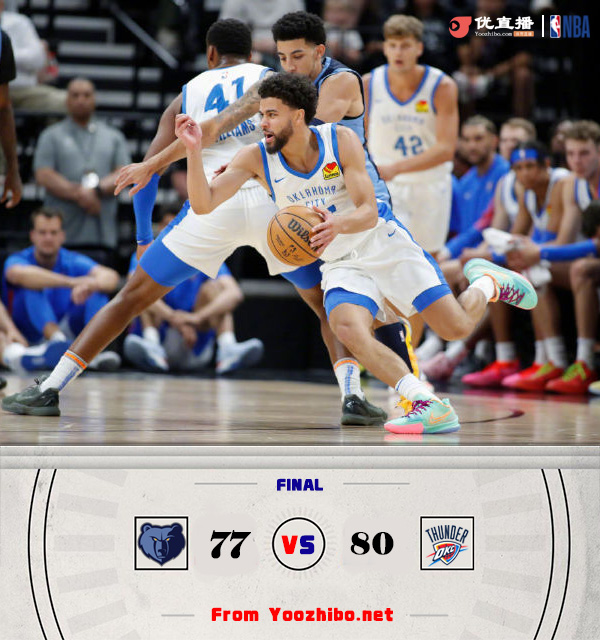 直播车7月11日讯 NBA盐湖城夏季联赛灰熊对阵雷霆。开场后灰熊连续进攻内线,杰米森频频拿分,雷霆多点开花紧咬比分。第二节两队进攻端表现不佳,米切尔异军突起独得11分,灰熊在GG-杰克逊带领下和雷霆僵持不下,上半场结束时雷霆反超1分。下半场两队依旧打得十分胶着,第四节雷霆一度打出攻势将比分拉开,灰熊又顽强的将比分追上,小皮蓬错失绝平三分,最终雷霆80-77击败灰熊。