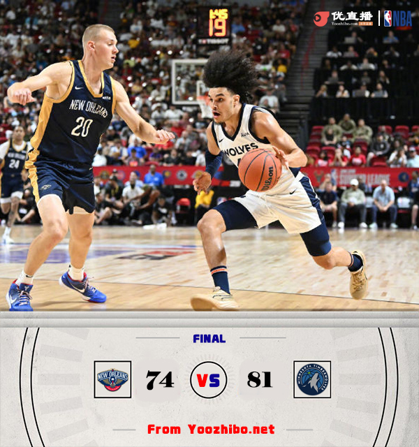 直播车讯 7月13日NBA夏季联赛,鹈鹕对阵森林狼。森林狼球星唐斯和鹈鹕新援德章泰-穆雷均到现场观战。比赛开始,鹈鹕连投带罚先拿5分,森林狼一波9-0强势回应,此后双方陷入缠斗,比分交替领先,次节森林狼持续发力再度完成9-0的攻击波取得两位数优势,鹈鹕不断冲击篮筐频频得手迅速追赶,半场战罢鹈鹕40-45落后森林狼5分。易边再战,鹈鹕一波6-0很快反超,森林狼连投带罚稳住局势,末节鹈鹕内外开花再度反超,双方争夺陷入白热化,关键时刻香农持续发力帮助森林狼确立优势,鹈鹕苦苦追赶无果。最终,森林狼81-74力克鹈鹕。