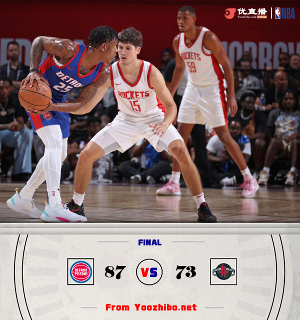 直播车 7月16日讯 NBA夏季联赛,火箭主场对阵活塞。比赛开始,双方进攻端都比较慢热,谢泼德上篮为火箭开局,双方打了半节各自仅得6分,随后火箭抓住机会一波9-0小高潮反超比分,首节火箭领先3分,次节双方还是找不到进攻状态,惠特摩尔还是没有运动战进球,双方展开拉锯战,丹尼斯-詹金斯里突外投扛起活塞进攻,半场活塞反超1分。下半场,双方进攻端终于找回状态展开拉锯战,37号秀克林特曼接连取分,而AJ-格里芬也找到手感单节砍下9分回应,惠特摩尔终于有运动战进球,三节火箭反超1分,末节活塞上来12-0直接建立主动权,打了半节谢泼德罚篮终于破荒,随后双方又接连打铁,活塞还是能掌握住双位数领先,最终活塞87-73力克火箭。