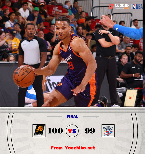 直播车 7月18日讯 NBA夏季联赛,太阳对阵雷霆。开场后太阳利用三分先声夺人,随后雷霆一波11-0的攻势反超比分。第二节雷霆依旧占据场面优势保持领先。下半场回来场上局面依旧胶着,第四节太阳奋起直追用一波11-0的反扑将比分反超,雷霆用两记三分稳住阵脚,并且在第四节末段重新夺回领先,罗迪最后2.1秒造成三分犯规并且三罚全中,最终太阳100-99逆转雷霆。
