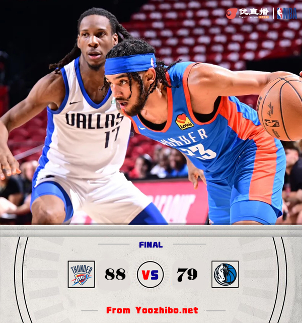 直播车 7月21日讯 NBA夏季联赛,雷霆对阵独行侠。雷霆选秀大会上摘到12号秀托皮奇、26号秀琼斯和38号秀米切尔。比赛开始,双方进入状态都不快,打了3分多钟各自仅拿到4分,威利接连内线打成帮助独行侠一波10-0进攻波一举确立领先,但雷霆接连造杀伤回应9-2追到差4分,次节双方你来我往展开拉锯战,雷霆多次追平比分但独行侠都能回应,双方次节打成22平,半场独行侠还领先4分。下半场双方上来接连打铁,凯利暴扣打破僵局,劳森反击立马回应,随后独行侠突陷得分荒,最后两分钟雷霆一波15-3攻击波一举反超9分,末节伯海姆三分助雷霆领先双位数,双方围绕10分左右分差展开拉锯战,普罗斯珀三分追到差5分,但独行侠连续失误,最终雷霆88-79力克独行侠。