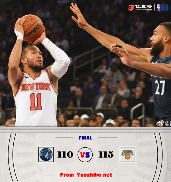 直播车10月14日讯 NBA季前赛,尼克斯主场迎战森林狼,本场比赛兰德尔缺战,无缘对阵老东家。比赛开始,迪文岑佐接连2记三分轰下9分,阿努诺比也能连砍10分强势回应,随后双方接连打铁乱战,唐斯联手布伦森助尼克斯首节领先5分,次节双方命中率依然不高,爱德华兹接连4记三分帮助森林狼一波进攻高潮反超并领先到双位数,但尼克斯外线多点开花也能回应在半场追到差2分。下半场,爱德华兹又是连续三分带队8-0重新拉开比分,随后布伦森带队接连攻内线再次止血,双方继续胶着拉锯战,唐斯有攻有传帮助尼克斯三节反超5分,末节双方换上替补练兵,佩恩接连取分帮助尼克斯扩大领先,随后双方继续深度轮换,尼克斯保持住领先优势,最终尼克斯115-110力克森林狼。