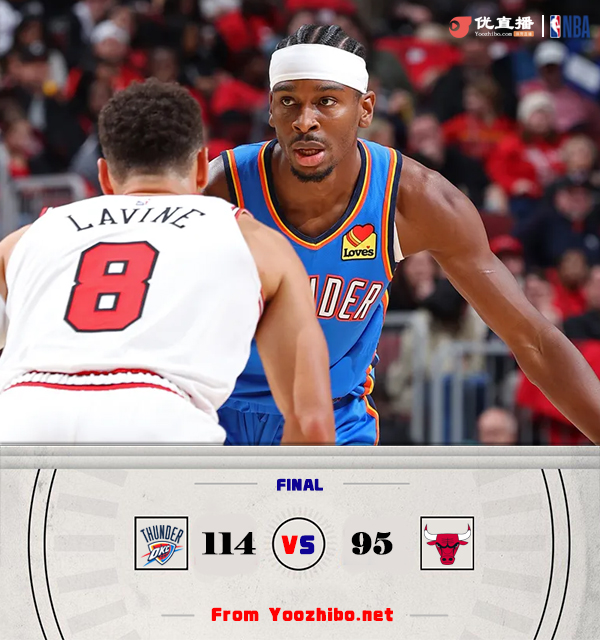 直播车10月27日讯 NBA常规赛,雷霆客场挑战公牛。基迪和卡鲁索各自迎战老东家。上半场,双方开场短暂相持,随后雷霆持续发力取得领先,次节公牛命中率下降,雷霆多点开花不断扩大优势,亚历山大和霍姆格伦联手拿分,半场战罢雷霆59-39领先公牛。下半场,两队围绕20分的分差展开拉锯战,雷霆稳扎稳打保持优势,公牛连投带罚苦苦支撑,末节雷霆没有给公牛机会,轻松将胜利收入囊中。最终,雷霆114-95轻取公牛,客场过关。