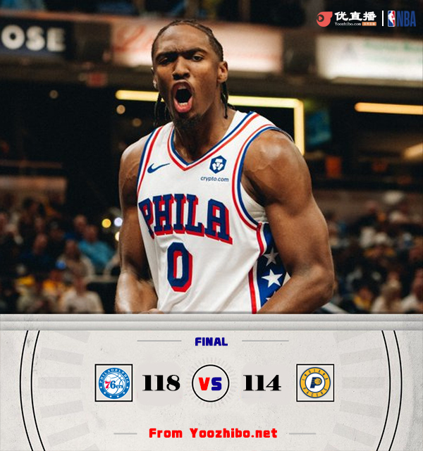 直播车讯10月28日讯 NBA常规赛,步行者主场迎战76人。步行者开局1胜1负,76人遭遇2连败。恩比德和乔治继续缺阵。一开场,双方对飙三分,76人持续发力取得微弱领先,次节步行者展开反击,多点开花反超比分,洛瑞三分止血,半场战罢步行者58-52领先76人。下半场,步行者命中率下降,76人频频冲击篮筐连投带罚拿分重夺领先,末节双方争夺陷入白热化,比分始终紧咬,76人挑战球权归属反被吹犯规,但步行者连续失误,76人趁势反超,哈利伯顿关键三分将比赛拖入加时。加时赛,双方依旧打得难解难分,马克西内外开花,步行者连投带罚还以颜色,又到关键时刻马克西挑篮拿分后送出封盖,76人祭出点球战术,最终以118-114力克步行者。