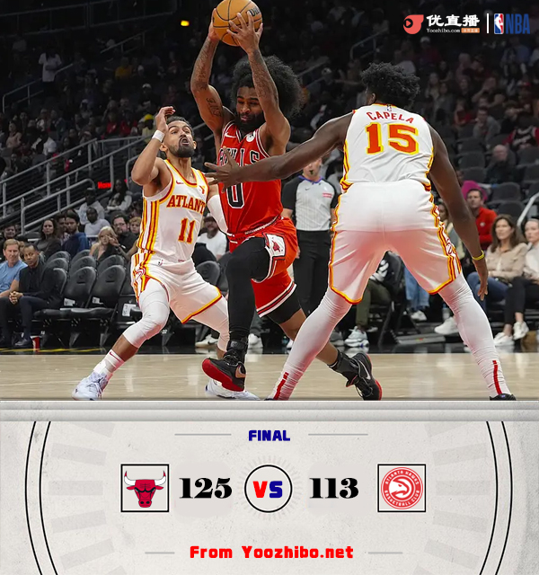 直播车11月10日讯 NBA常规赛,公牛对阵老鹰,公牛最近遭遇4连败,老鹰上场比赛惜败活塞。开场后老鹰在特雷-杨的带领下首先打出攻势,特雷-杨自己出手不多但连连为队友送出精彩助攻,卡佩拉在内线也是表现相当活跃,公牛主要依靠拉文和武切维奇的单打追分。第二节回来两队手感都不错,连续在外线对飚三分,公牛虽然多点开花,但老鹰进攻也相当犀利没有给公牛缩小分差的机会,其中杰伦-约翰逊状态火热频频砍分。易边再战,老鹰延续状态以7-0开局,公牛经过暂停调整连续用三分稳住阵脚,第四节上来老鹰进攻断电,公牛趁势追击一波14-3的反扑完成反超,特雷-杨和杰伦-约翰逊凭借个人能力进攻也未能奏效,反倒是拉文和怀特关键时刻表现硬气先后拿分帮助公牛锁定胜局,最终公牛125-113逆转老鹰结束4连败,老鹰遭遇2连败。