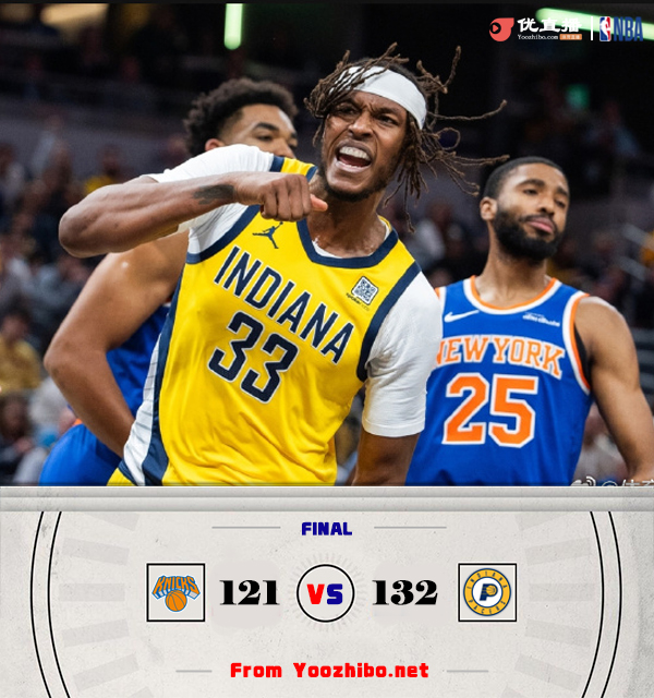 直播车11月11日讯 NBA常规赛,步行者主场迎战尼克斯。目前步行者4胜5负,尼克斯4胜4负。比赛开始,双方迅速进入状态展开对攻,哈利伯顿继续组织进攻,马瑟林连续3记三分命中,但尼克斯首发五虎也能给出回应,首节步行者领先3分,次节阿努诺比里突外投反超比分,双方展开拉锯战,哈利伯顿和布伦森展开对飚,马瑟林继续出色状态接连三分追分,半场尼克斯反超3分。下半场,唐斯打得很强硬,尼克斯一波10-0建立主动权,随后沃克连续三分一度反超,好在哈特连续突破止血,三节尼克斯依然领先2分,末节双方展开拉锯战,哈利伯顿联手马瑟林帮助步行者反超比分,随后步行者下起三分雨直接拉开双位数领先,最终步行者132-121力克尼克斯。