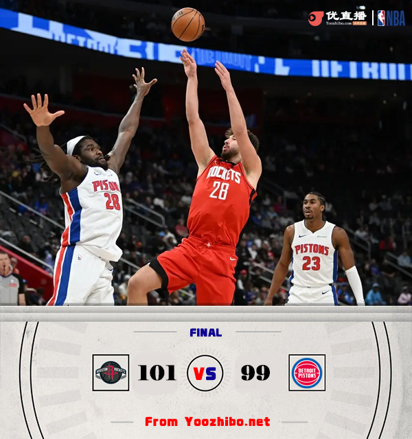 直播车11月11日 NBA常规赛,活塞主场迎战火箭。比赛开始,火箭上来反客为主打出11-2不错开局,CC和艾维接连冲击内线追分,双方后半节命中率急剧下降,首节火箭领先3分,次节活塞上来就发力一波小高潮直接反超比分,狄龙突破终于止住颓势,双方展开拉锯战,活塞始终保持微弱领先并在半场反超2分。下半场,双方命中率还是不高,但比分还是很胶着,范弗里特里突外投一度反超比分,最后3分钟火箭突然发力打出10-2小高潮取得8分领先,末节小哈达威联手比斯利接连3记三分带队轰出16-3攻击波再次反超比分,比赛进入白热化,火箭连续冲到前场篮板补篮领先到5分,哈里斯三分续命后关键传球失误,申京关键两罚中一,火箭采取“点球”战术,哈里斯绝平罚篮第一罚就不中,最终火箭101-99险胜活塞。