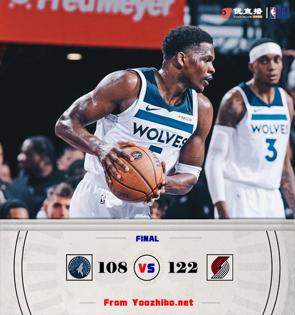 直播车11月13日讯 NBA常规赛,森林狼对阵开拓者,森林狼上场被热火绝杀,开拓者最近遭遇3连败。开场后两队你来我往还打得势均力敌,不过森林狼第一节末段进攻断电,开拓者趁机建立起两位数领先。第二节爱德华兹带领森林狼找回进攻状态,里德手感火热也是连连砍分,不过开拓者状态也是相当火热,罗威内线活跃多次上演暴扣,班顿外线也是神准。下半场回来两队主力依旧打得势均力敌,开拓者凭借轮换阵容的发挥将分差拉大,森林狼只有里德状态不错。最后一节森林狼再次组织反扑,不过开拓者整体发挥依旧稳定,没有给森林狼追上比分的机会,最终开拓者122-108击败森林狼结束3连败。