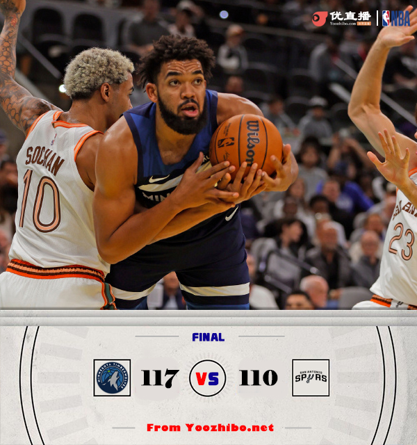 直播车11月11日讯11月11日讯 NBA常规赛西部季中锦标赛,马刺今日迎战森林狼,前者近来遭遇三连败状态不佳,后者则是取得四连胜势头正佳。比赛上来,马刺就率先进入状态打出9-2的完美开局取得领先,整个第一节森林狼都处于落后,次节森林狼的进攻逐渐打开,比分也是追了回来,两队开始展开拉锯,半场结束时森林狼反超2分;下半场回来,森林狼占据了场上的主动权,分差迅速达到了两位数,三节结束时马刺已经落后17分,末节马刺虽然有反扑的势头但终究未能完成逆转,最终森林狼力克马刺,迎来五连胜的同时也送给后者四连败。