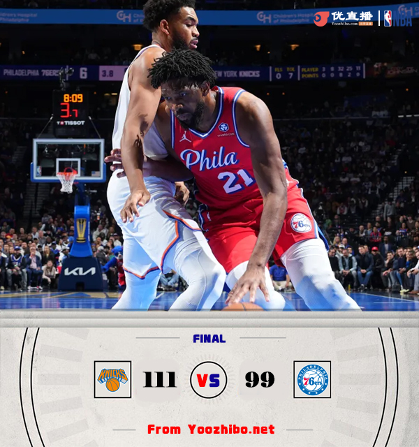 直播车11月13日讯 NBA东部NBA杯A组,76人主场迎战尼克斯。此役76人球星恩比德迎来赛季首秀。比赛开始,尼克斯多点开花占据主动,尼克斯内外开花迅速迫近比分,次节双方继续缠斗,乔治攻防两端立功,恩比德连续造成杀伤,尼克斯多点开花强势回应,半场战罢尼克斯54-50领先76人。易边再战,布伦森崴脚一度返回更衣室,恩比德飙中三分,尼克斯持续发力取得领先,76人连投带罚迅速追赶,末节尼克斯持续发力打出11-0取得两位数领先,76人苦苦追赶无果。最终,76人99-111不敌尼克斯,主场落败。