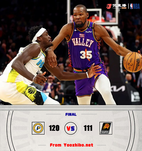 直播车讯 北京时间12月20日讯 NBA常规赛,太阳今日迎战步行者,两队近来状态都可以,均是取得两连胜,此役比尔可以出战,内史密斯缺战。比赛上来,太阳率先进入状态取得领先,但随后他们陷入到近四分钟的得分荒,步行者趁势轰出一波14-0的攻势完成反超,之后的比赛太阳虽然一直紧咬比分却始终无法重夺领先,半场结束时步行者仍领先1分;下半场回来,步行者重新找到节奏,进攻端势如破竹单节再轰37分,分差也是拉开到了十分以上,对于太阳更为不利的是布克因腹股沟伤势提前退赛,末节步行者也没有再给对手任何机会,即便是杜兰特连续砍分也无济于事,最终步行者轻取太阳,迎来三连胜的同时也终结了后者的连胜。