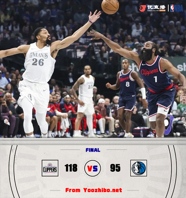 直播车讯 北京时间12月20日讯 NBA常规赛,快船客场挑战独行侠。快船15胜12负排西部第9,独行侠17胜9负暂列西部第4。比赛开始,双方开场势均力敌,比分始终紧咬,独行侠内外开花取得8分优势,诺曼-鲍威尔连中三分独得8分带队顽强咬住,哈登和小德里克-琼斯相继命中三分,半场战罢快船50-49领先独行侠。易边再战,邓恩二级恶意犯规被直接驱逐,但快船持续发力将分差拉开到两位数,末节双方围绕10分分差展开拉锯战,快船连中三分扩大将分差拉开到20分以上,独行侠大势已去无力回天。最终,快船118-95击败独行侠,客场过关。