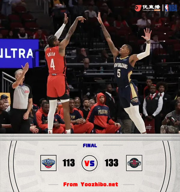 直播车讯 北京时间12月20日讯 NBA常规赛,火箭主场迎战鹈鹕,火箭目前17胜9负排在西部第3位,鹈鹕4连败后5胜22负西部垫底,本场比赛锡安和英格拉姆继续缺阵。比赛开始,火箭多点开花上来就发力,外线接连三分打出21-3超级攻击波一举奠定领先,除谢泼德外火箭首节出场球员皆有得分,火箭首节领先14分,次节双方展开对攻战,墨菲和穆雷有攻有传带队追分,但狄龙连中4记三分半场轰下20分给出回应,次节双方打成27平。下半场,杰伦-格林开始发力,接连冲击内线得分迅速上双,火箭顺势拉开20分以上领先,赫伯特-琼斯三分止血,随后杰伦-格林继续冲筐单节砍22分,三节火箭领先到20分,末节麦科勒姆接连造杀伤追分,但杰伦-格林再送暴扣回应,火箭牢牢掌握住十几分领先,最终火箭133-113轻取鹈鹕,送对手5连败。