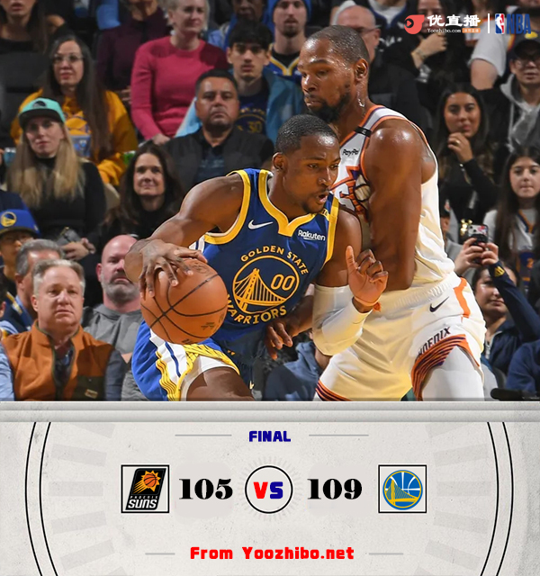 直播车讯北京时间12月29日讯 NBA常规赛,勇士主场迎战太阳。勇士3连败目前仅排在西部第十一,太阳西部第十。布克缺阵,库里和追梦迎来复出。比赛开始,比尔手感火热4投全中独得10分,库里和库明加联手带队高效拿分强势反超,杜兰特连续强解拿分,次节勇士连续失误,太阳利用防守反击轰出26-7的进攻狂潮取得两位数领先,追梦连中三分止血,库里压哨命中,半场战罢太阳65-61领先勇士。易边再战,勇士一波7-0的夺回优势,此后双方陷入缠斗,比分交替领先,太阳持续发力占据主动,末节勇士打出10-1反超比分,双方争夺陷入白热化,关键时刻杜兰特和库明加各自两罚全中,太阳连续打铁,勇士罚球杀死比赛。最终,勇士109-105力克太阳,结束了自己的3连败。