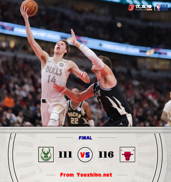 直播车讯北京时间12月29日讯 NBA常规赛激战正酣,公牛和雄鹿两支东部球队直接对话,此前因小腿伤势和非新冠疾病缺席4场的利拉德此役复出,字母哥因生病继续缺阵。此役一上来公牛外线率先开张,雄鹿开局状态慢热,米德尔顿和波蒂斯短暂止血,公牛多点开花确立优势,首节结束时公牛领先8分,次节回来,雄鹿逐渐找到进攻感觉,利拉德连投带罚不断杀伤,大洛联手米德尔顿外线续上火力,雄鹿稳扎稳打缩小分差,半场战罢,雄鹿仅落后2分。易边再战后两队进攻火力放缓,利拉德连投带罚串联全队,公牛找回状态及时回应,双方你来我往比分紧咬,三节结束后雄鹿反超1分,末节决战,基迪突然发力连续取分,公牛迅速夺回优势,决胜时刻雄鹿连续不中,公牛连中罚球锁定胜局,最终公牛116-111力克对手终结3连败。