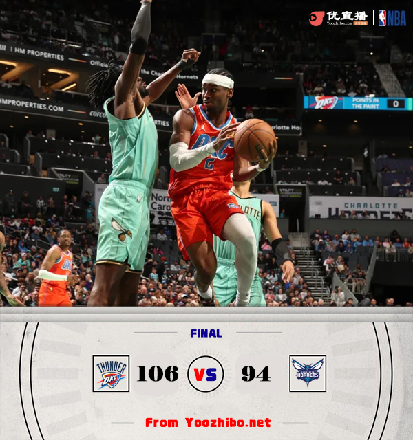 直播车讯北京时间12月29日讯 NBA常规赛,雷霆客场挑战黄蜂。雷霆9连胜高居西部第一,黄蜂6连败排东部第十三。上半场,雷霆率先发力,连中三分打出15-5的开局,黄蜂不断冲击内线努力追赶,米西奇连中三分不断缩小分差,雷霆内外开花保持优势,亚历山大得分助攻一肩挑,半场雷霆61-46领先黄蜂。下半场,雷霆稳扎稳打保持优势,黄蜂里突外投苦苦支撑,末节黄蜂占得先机迫近比分,雷霆多点开花稳住局势,黄蜂大势已去。最终,雷霆106-94击败黄蜂,豪取10连胜。