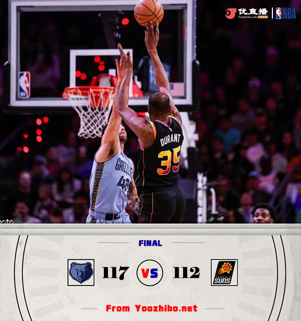直播车1月1日讯 NBA常规赛,灰熊对阵太阳。灰熊上场比赛大败给雷霆,本场比赛莫兰特继续缺阵,太阳最近遭遇2连败,本场比赛布克复出。开场后贾伦-杰克逊连续强攻得手帮助灰熊以11-2开局,虽然太阳进攻逐渐找到感觉,但贾伦-杰克逊完全打爆太阳内线,他首节独得19分带领灰熊建立起10分优势。第二节上来太阳一波7-0的反扑迫近比分,这次换到贝恩站出来,他外线连中三分独得10分帮助灰熊稳住阵脚,两队陷入拉锯战,比尔受伤离场。易边再战,太阳多点开花一路追到只差2分,但随后他们自己连续出现失误又被灰熊将比分拉开,太阳多次努力追分,但始终差一口气未能将比分追上,康查尔跑篮下空位打成2+1,杜兰特强攻不中,最终灰熊117-112送太阳3连败。
