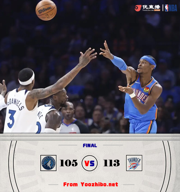 直播车1月1日讯 NBA常规赛继续进行,西部头名雷霆与森林狼迎来青春对话,雷霆豪取11连胜,26胜5负稳居西部榜首,森林狼近期迎来三连胜,17胜14负位列西部第8位。首节开打后双方早早进入状态,兰德尔和康利外线发炮,里德内线不断取分,亚历山大单节10分及时回应,首节结束时森林狼领先3分,次节回来,开局阶段雷霆继续紧咬比分,但中段雷霆进攻出现停滞,爱德华兹飚中3记三分率队稍稍拉开比分,半场战罢,森林狼确立6分优势。短暂休整后雷霆及时复苏,连中三分回敬13-0进攻高潮一举反超,末段森林狼进攻依然没有起色,亚历山大则予取予求单节狂揽19分,雷霆带着14分优势进入末节,末节上来,森林狼找回进攻感觉不断蚕食分差,但亚历山大飚中关键三分,雷霆顶住对手反扑,最终雷霆113-105击败森林狼迎来12连胜。