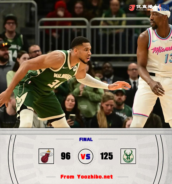 直播车讯 1月24日讯 NBA常规赛,雄鹿客场挑战热火。雄鹿4连胜以24胜17负高居东部第4,热火21胜21负东部第9。本场比赛因天气原因被延迟1小时开赛,巴特勒被球队禁赛。一开场,雄鹿手感冰凉,热火打出13-3的攻势取得两位数领先,字母哥高效输出带队迅速迫近比分,次节雄鹿全面回暖,单节轰下44分净胜热火19分,利拉德1秒内连投带罚收获6分,半场战罢雄鹿71-55领先热火。下半场,双方命中率下降,得分都很困难,雄鹿率先回暖将分差拉开到20分以上,末节双方围绕20分的分差展开拉锯战,热火大势已去无力回天。最终,雄鹿125-96大胜热火,客场过关。