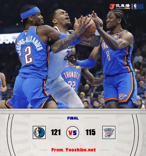 直播车1月24日讯 NBA常规赛,独行侠对阵雷霆,独行侠最近遭遇2连败,雷霆依旧稳居西部榜首,并且取得2连胜,本场比赛两队都有多人缺阵。开场后杰伦-威廉姆斯表现抢眼帮助球队取得领先,独行侠多点开花追上比分,并且在丁威迪和华盛顿的发挥下一度反超比分,场上局面陷入僵持,卡鲁索三分命中帮助雷霆领先1分结束第一节。第二节回来雷霆外线多点开花扩大优势,普罗斯珀异军突起接连砍分帮独行侠缩小分差。易边再战,华盛顿成为球队进攻发起点帮助独行侠再度反超比分,多特打到加福德裆部被吹二级恶意犯规被驱逐,独行侠趁着这波机会将领先拉大到13分。最后一节亚历山大和杰伦-威廉姆斯轮番砍分帮雷霆将比分追上,关键时刻丁威迪站出来连续回应,克莱伯也投进两记三分,独行侠将领先保持到最后,最终独行侠121-115力克雷霆结束2连败,雷霆的2连胜被终结。