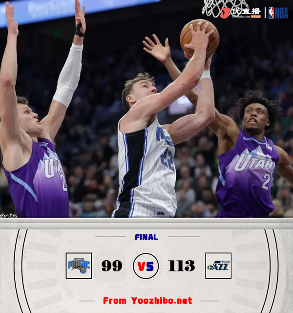 直播车2月2日讯 NBA常规赛,爵士主场迎战魔术,爵士目前8连败后10胜36负西部垫底,魔术则是2连败后24胜25负排名东部第8。比赛开始,双方上来很是慢热,进攻端连续打铁,小瓦靠罚球止血,但爵士科林斯和凯斯勒接连送暴扣,马尔卡宁外线也接连发炮顺势拉开双位数领先,次节魔术进攻端继续不在状态,主力疯狂打铁,反倒是爵士多点开花扩大领先,席尔瓦抢断后压哨三分助队半场追到差12分。下半场,班凯罗进攻端还是铁,爵士抓住机会接连打成转换,一波8-0小高潮领先到20分以上,随后魔术接连罚球止血,三节魔术还落后16分,末节小瓦接连造杀伤罚球追分,但爵士总能回应一度又拉开20分以上领先,小瓦格纳里突外投单节砍下15分追分,但无奈分差太大,最终爵士113-99力克魔术,终止8连败同时送对手3连败。