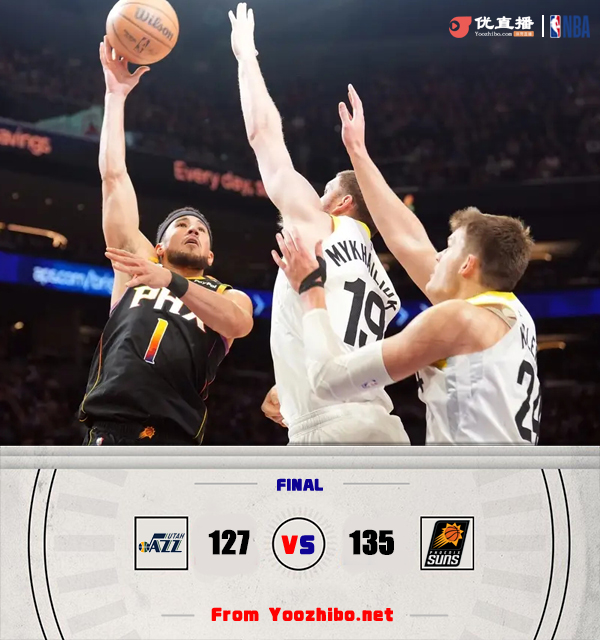 直播车讯 北京时间2月8日讯 NBA常规赛,太阳主场迎战爵士。太阳3连败,以25胜25负排西部第9,爵士12胜37负西部倒数第2。比赛开始,布克高效输出,但爵士多点开花将分差拉开到两位数,次节太阳火力全开,布克里突外投连续得分,爵士命中率下降,太阳单节净胜10分,半场双方战成55平。易边再战,双方大打对攻,太阳火力更猛,布克手感滚烫第三节再拿10分,末节太阳占得先机将分差拉开到两位数,爵士奋力反击轰出13-0的攻击波扳平比分,双方争夺陷入白热化,关键时刻凯斯勒连续补篮拿分,科利尔压哨也有,阿伦三分绝平,将比赛拖入加时。加时赛,太阳连中三分轰出11-3的攻击波锁定胜局。最终,太阳135-127加时击败爵士,主场过关。