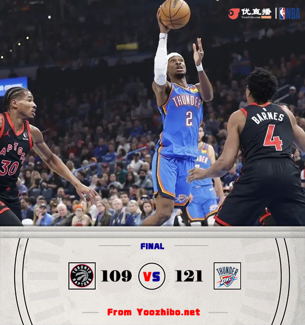 直播车讯 北京时间2月8日讯 NBA常规赛,雷霆今日迎战猛龙,前者近来取得三连胜,后者则是两连败,此役霍姆格伦迎来复出,巴雷特、英格拉姆、珀尔特尔和多特等人缺战。比赛上来,两队打得相对胶着,不过到了首节末段猛龙的进攻突然哑火,雷霆趁势打出一波10-0的小高潮拉开分差,次节猛龙发起反扑连拿九分迫近比分,但雷霆及时给出回应没有给他们反超的机会,半场结束时分差依旧有11分;下半场回来,两队保持拉锯,分差没有发生太多改变,复出的霍姆格伦场上存在感也不是很强,单节再次未得分甚至没有出手,末节猛龙没有再获得任何机会,分差也是进一步突破二十分,最终雷霆轻取猛龙,迎来四连胜的同时也送给后者三连败